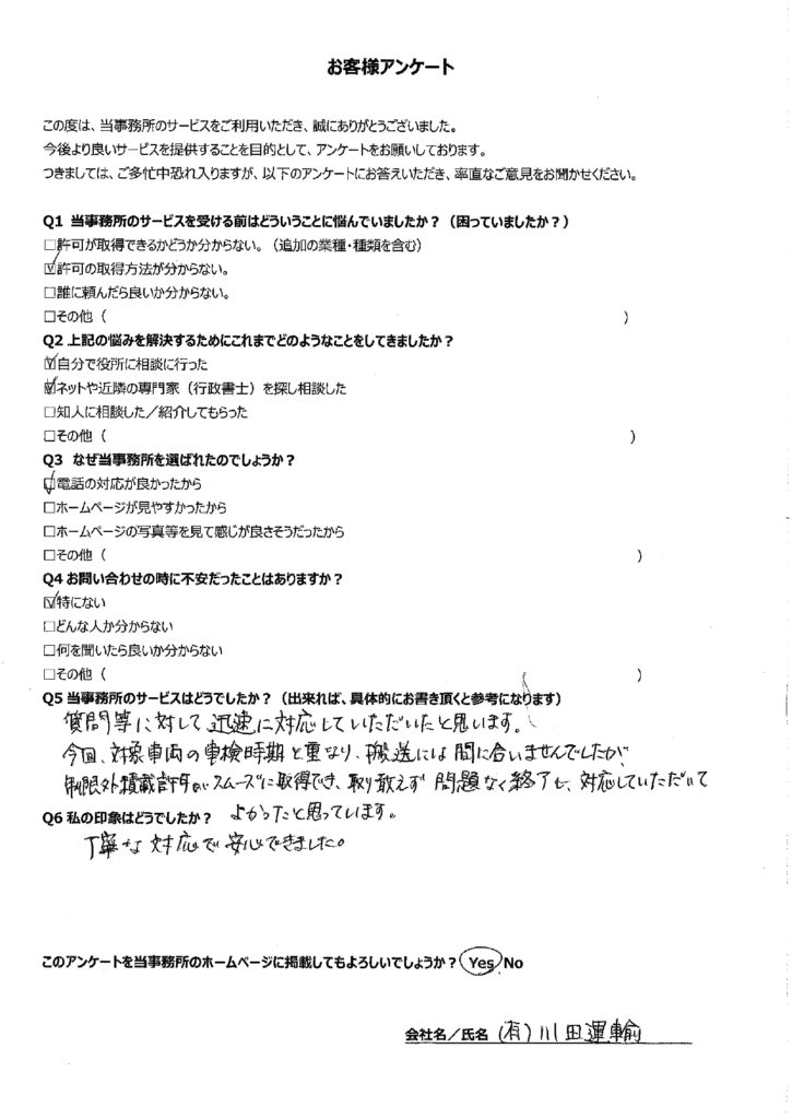 当事務所は特殊車両通行許可に特化した行政書士事務所です。申請に必要な内容を分かりやすく、丁寧に、誠実に、ご説明・ご対応させていただきます。
