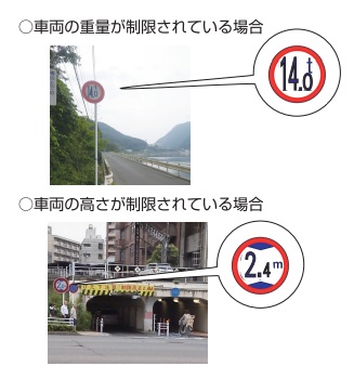 一般制限値以下の車両であっても、橋、高架道路、トンネル等車両の重量、高さで制限値が定められているときは、これを超えて通行してはいけません。